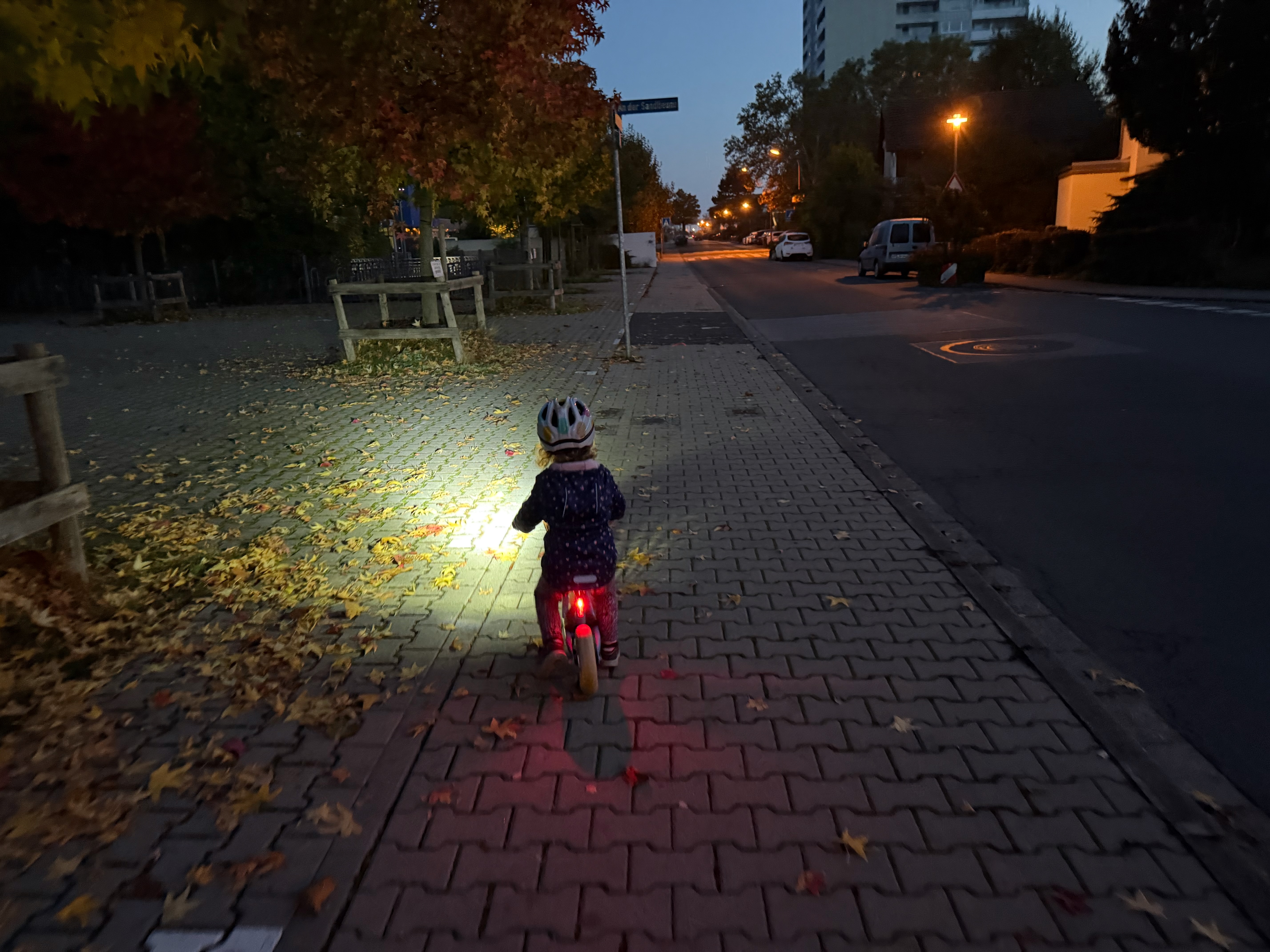 Es ist Herbst und langsam wird es morgens und abends dunkler. Bitte denkt daran, eure Kinder an das Fahrradlicht zu erinnern. Ich wohne neben einer Schule und bringe meine Kleine oft mit dem Fahrrad/Laufrad in den Kindergarten nebendran und die Anzahl an Schüler:innen ohne Licht erschreckt mich jeden Tag. Noch mehr erschreckt mich natürlich die Anzahl die Assis im Auto, die ohne jede Rücksicht durch die Schulstraße brettern, alle 4 Meter fast eine Person umfahren, aber als Fahrradfahrer weiß ich, dass wir nicht mehr tun können als uns und die Kinder zu beleuchten.